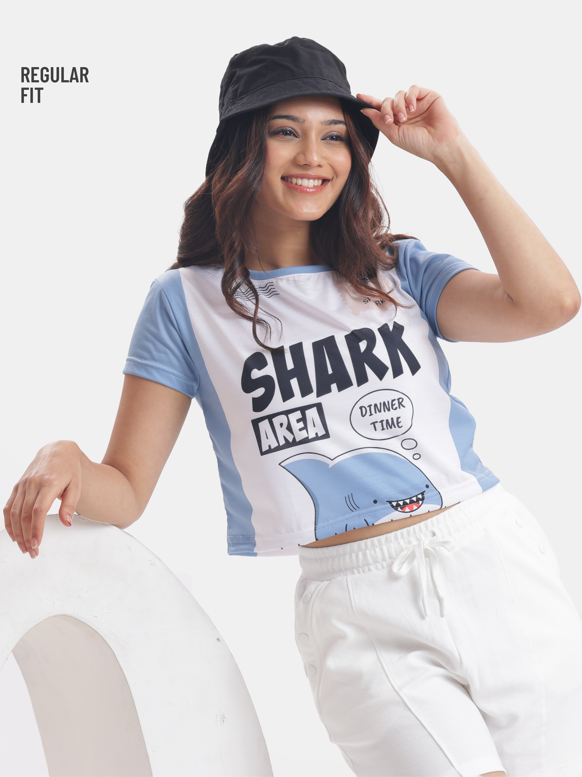 Dive into a casual yet stylish vibe with this playful white and blue crop top that features a cheeky fat shark proclaiming it's "shark area" and "dinner time," making it the perfect choice for laid-back outings with your bf (boyfriend) or friends and family , easily paired with your favorite denim shorts or joggers for a fun, relaxed beach look.