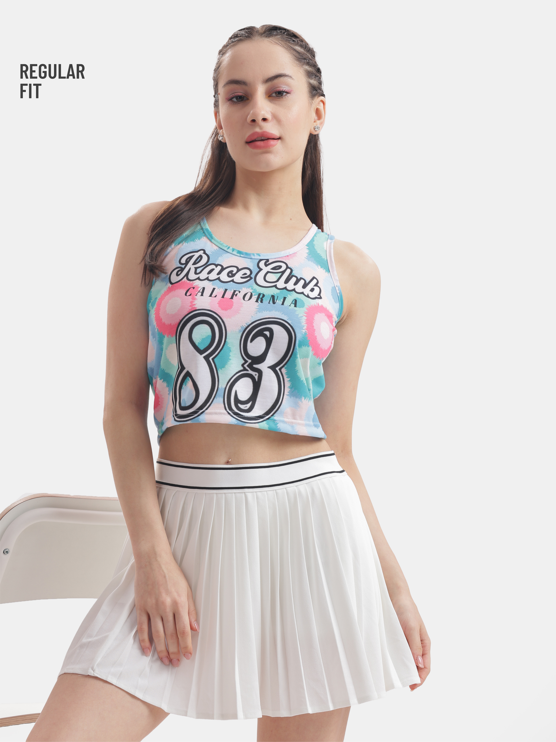 Get ready to turn heads in this vibrant, multi-colored floral tie dye crop tank top featuring sporty number 83, perfect for those laid-back days when you want to feel stylish yet comfortable while channeling your inner cheerleader vibe at the car race club in California USA; pair it with your favorite denim shorts or favourite joggers for an effortlessly chic look.