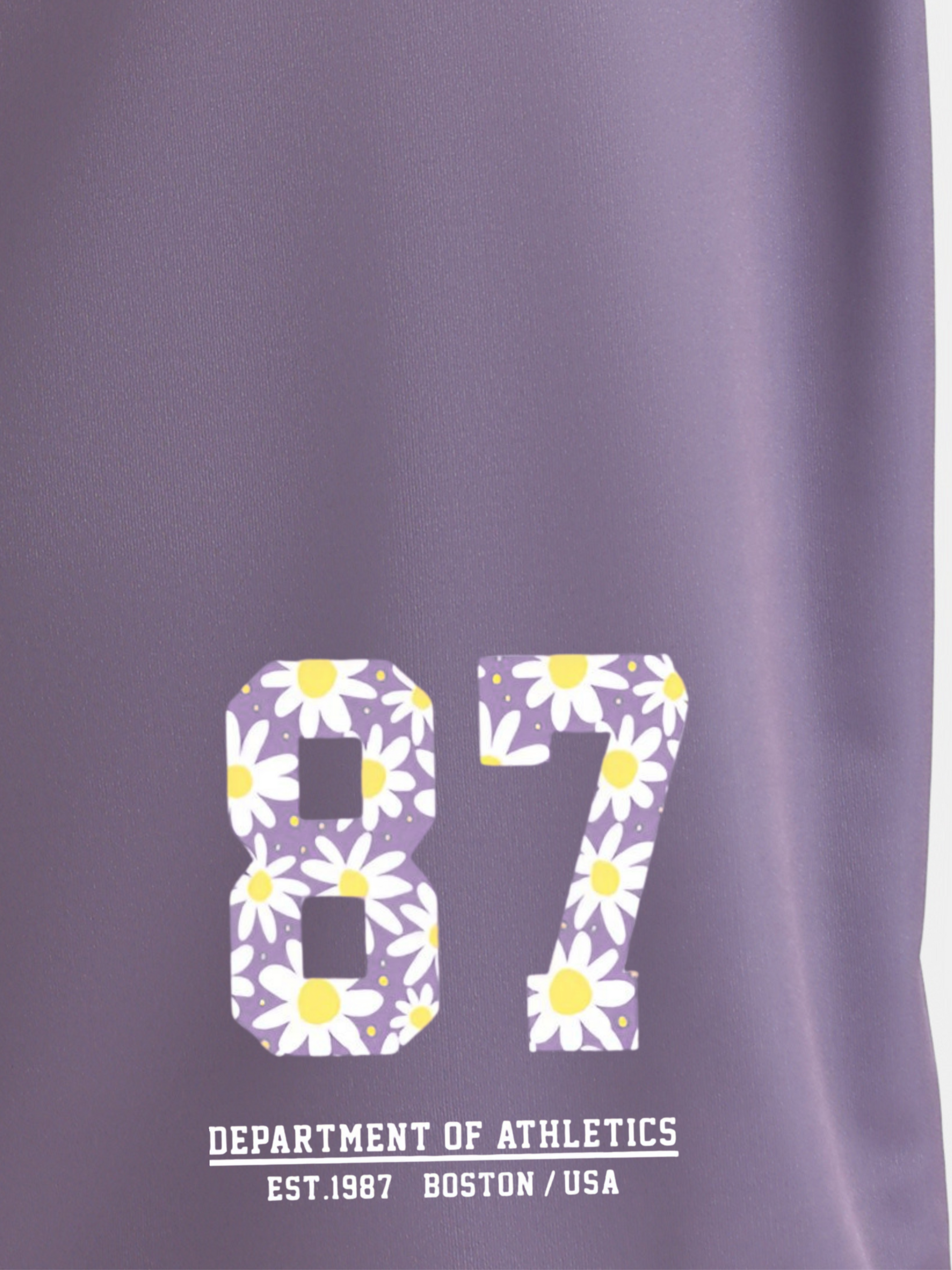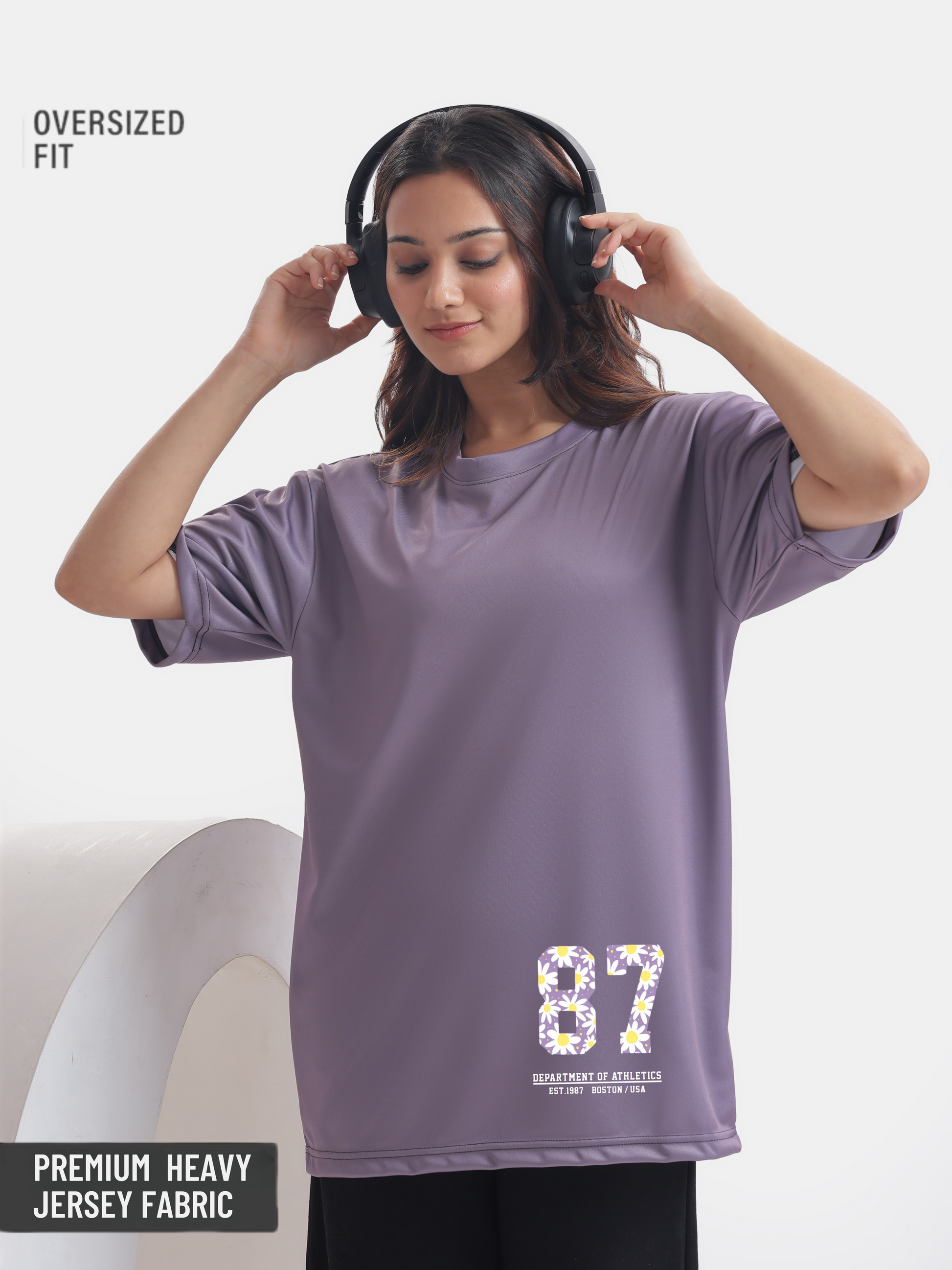 This light coffee brown oversized t-shirt for woman is the perfect blend of casual style and sporty flair, featuring a vibrant sporty number 87 adorned with flowers and the playful English typography "Department of Athletics, Boston, United States of America, est. 1987," making it an ideal choice for everything from athletic gym workouts to laid-back outings with your bf (boyfriend) or friends or family, and it pairs effortlessly with your favorite jeans or favourite shorts for a chic, relaxed look.
