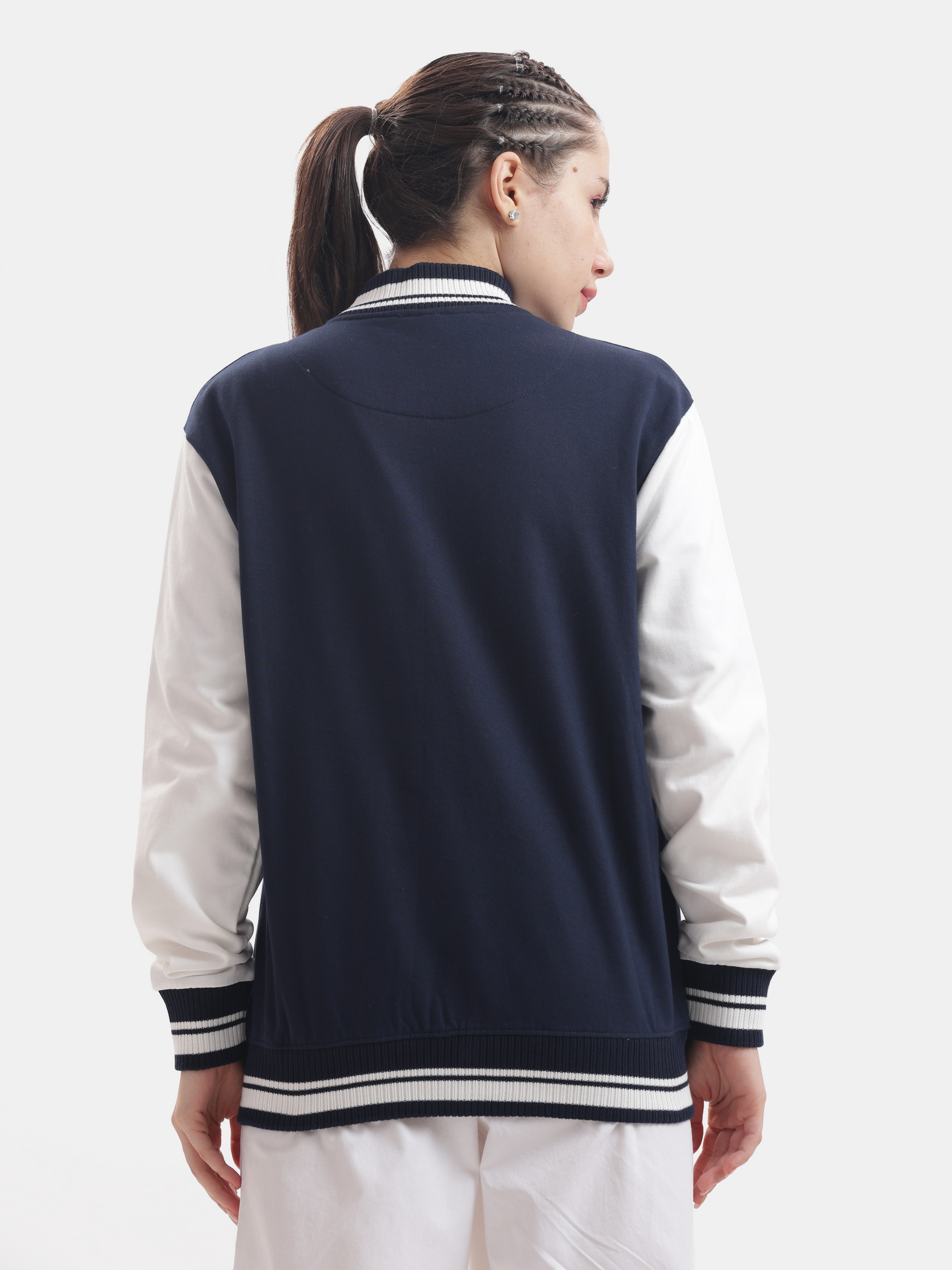 This premium casual wear navy blue and white varsity jacket for women is crafted from thick, luxurious cotton fabric, making it the perfect stylish companion for casual outings with friends and family, bike rides with your bf (boyfriend), or laid-back meetups with your colleagues, all while embodying a fun story of adventure with two best friends—a bear in a helmet riding a scooter and a dog enjoying the ride, under a shining sun, reminding you that every day can be a stylish adventure.