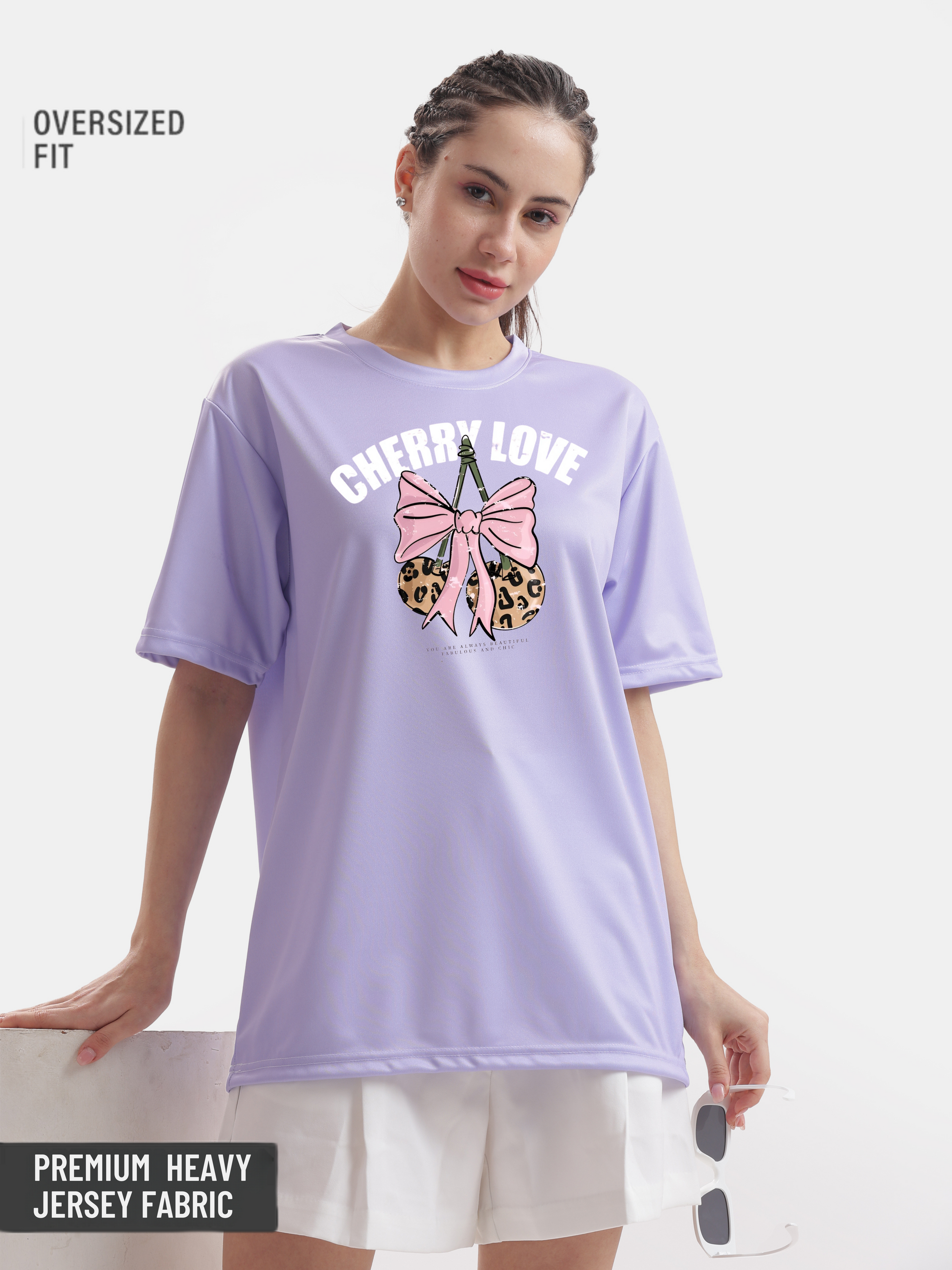 Embrace effortless style with this relaxed oversized light lavender t-shirt, featuring an eye-catching cherry design wrapped in leopard skin and a playful pink ribbon, making it the perfect choice for athletic activities(sports and gym sessions) or casual outings with your bf (boyfriend) or friends and family, all while reminding you that you are always beautiful, fabulous, and chic.
