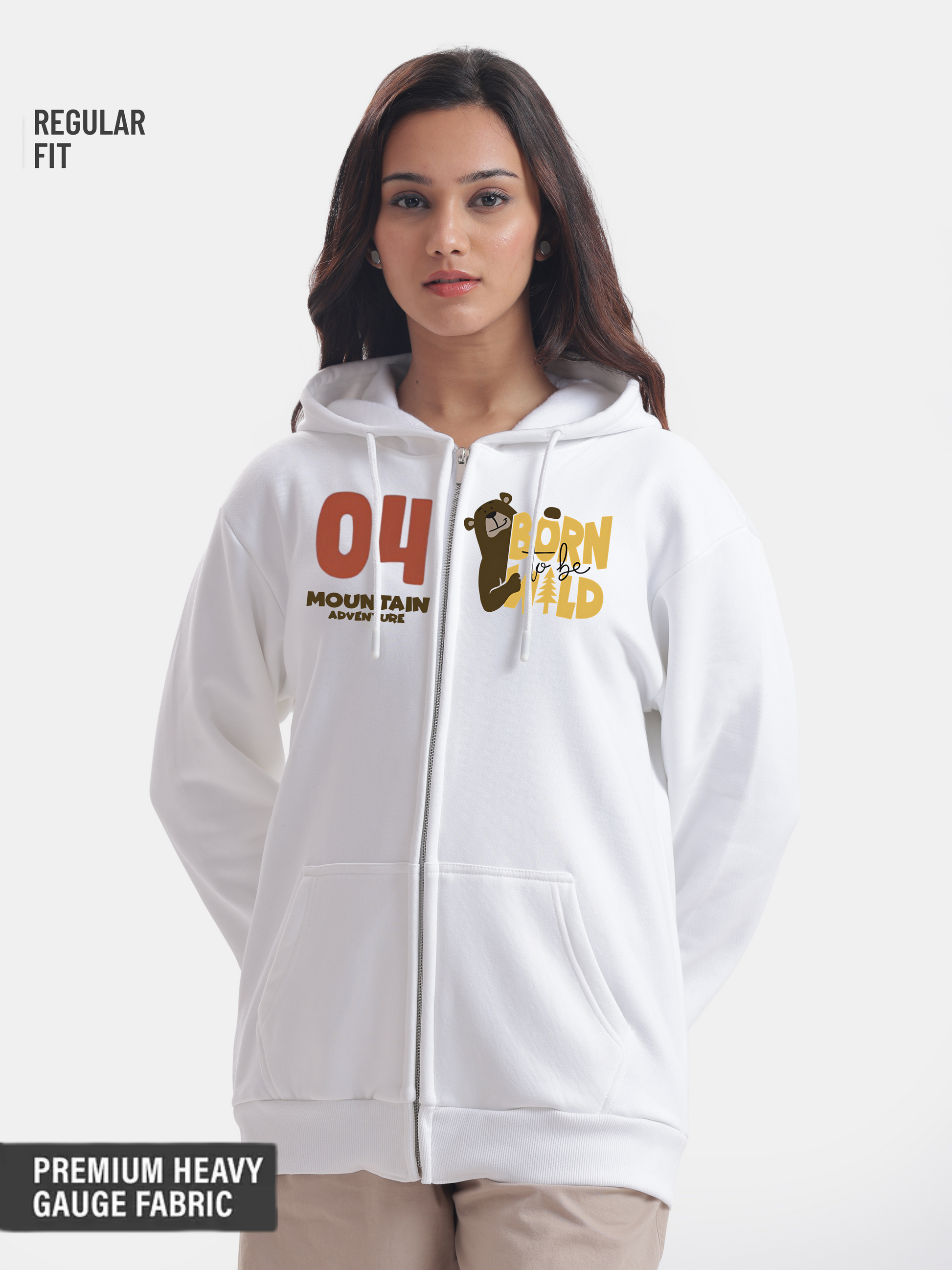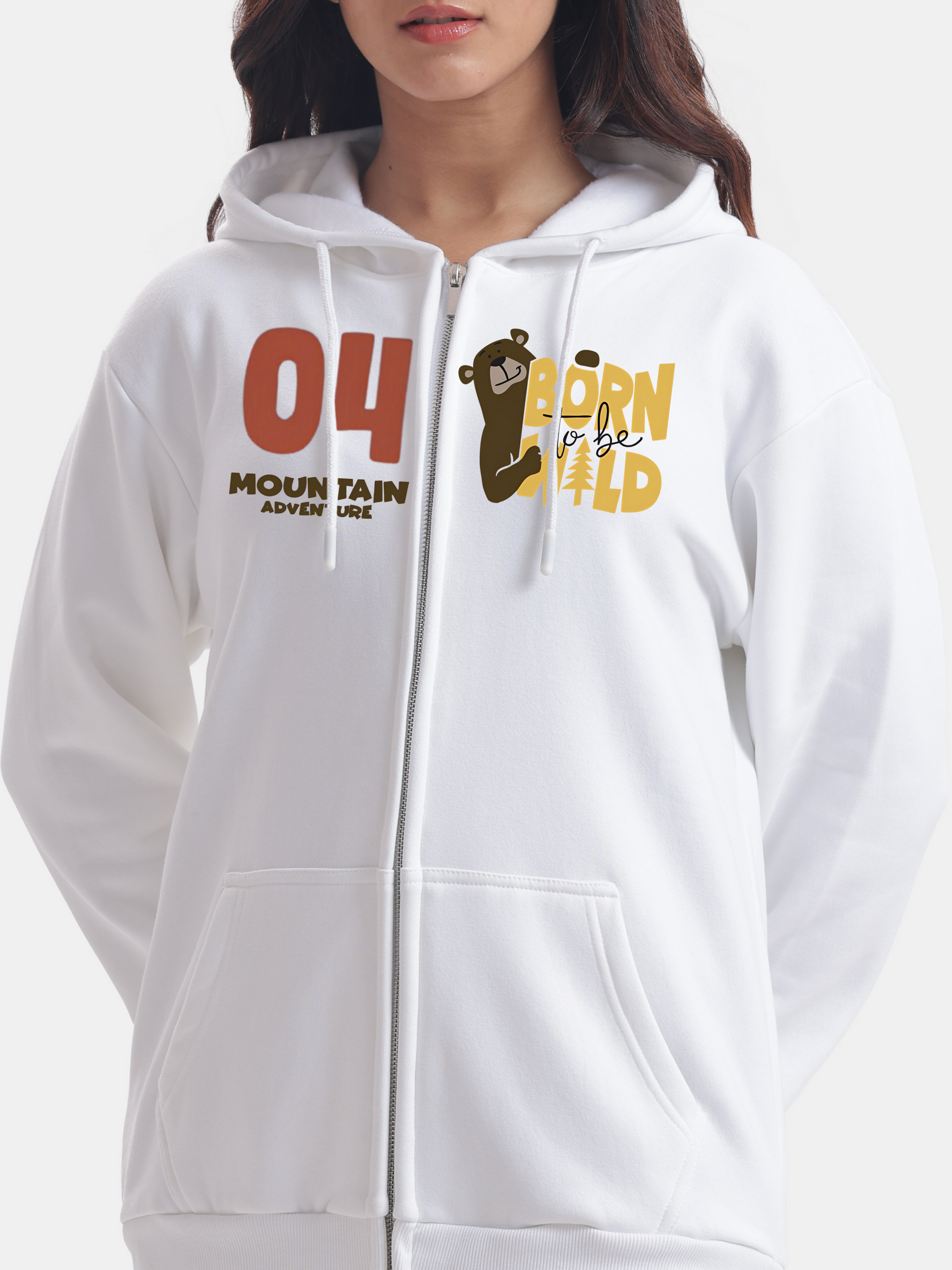 Embrace your adventurous spirit with this cozy white zip hoodie, featuring an adorable brown bear holding a banner that proudly declares "born to be wild" on one side, while the other side showcases a sporty number 04 alongside the words "mountain adventures," making it the perfect stylish companion for both casual outings and relaxed weekend adventures with your bf (boyfriend) or friends and family.