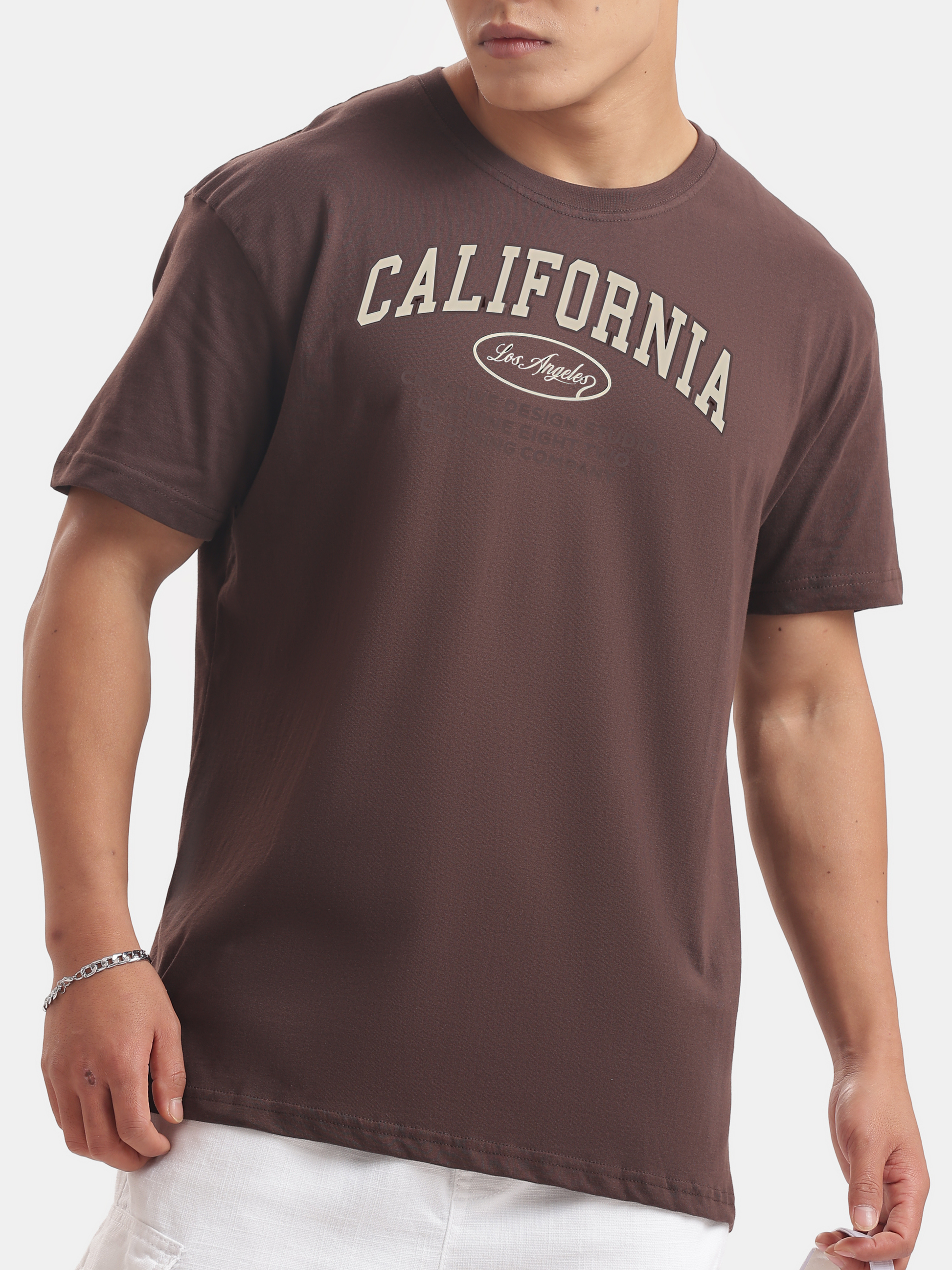 Embrace a laid-back vibe with this coffee brown t-shirt featuring a simple classic retro English typography design that states "California Los Angeles USA Creative Design Studio One Nine Eight Two", making it the perfect stylish piece to pair with your favorite jeans or favourite shorts for a casual day out with your gf (girlfriend) or friends and family.