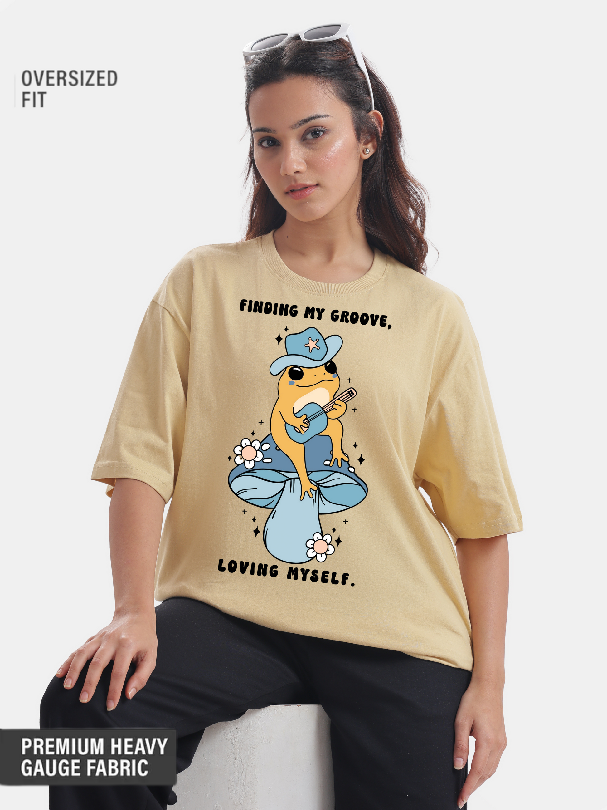 Embrace your unique style with this relaxed oversized beige t-shirt featuring a whimsical frog in a cowgirl hat, sitting on a mushroom and strumming a guitar, reminding you that finding my groove and loving myself can be effortlessly stylish when paired with your favorite jeans or favourite shorts.