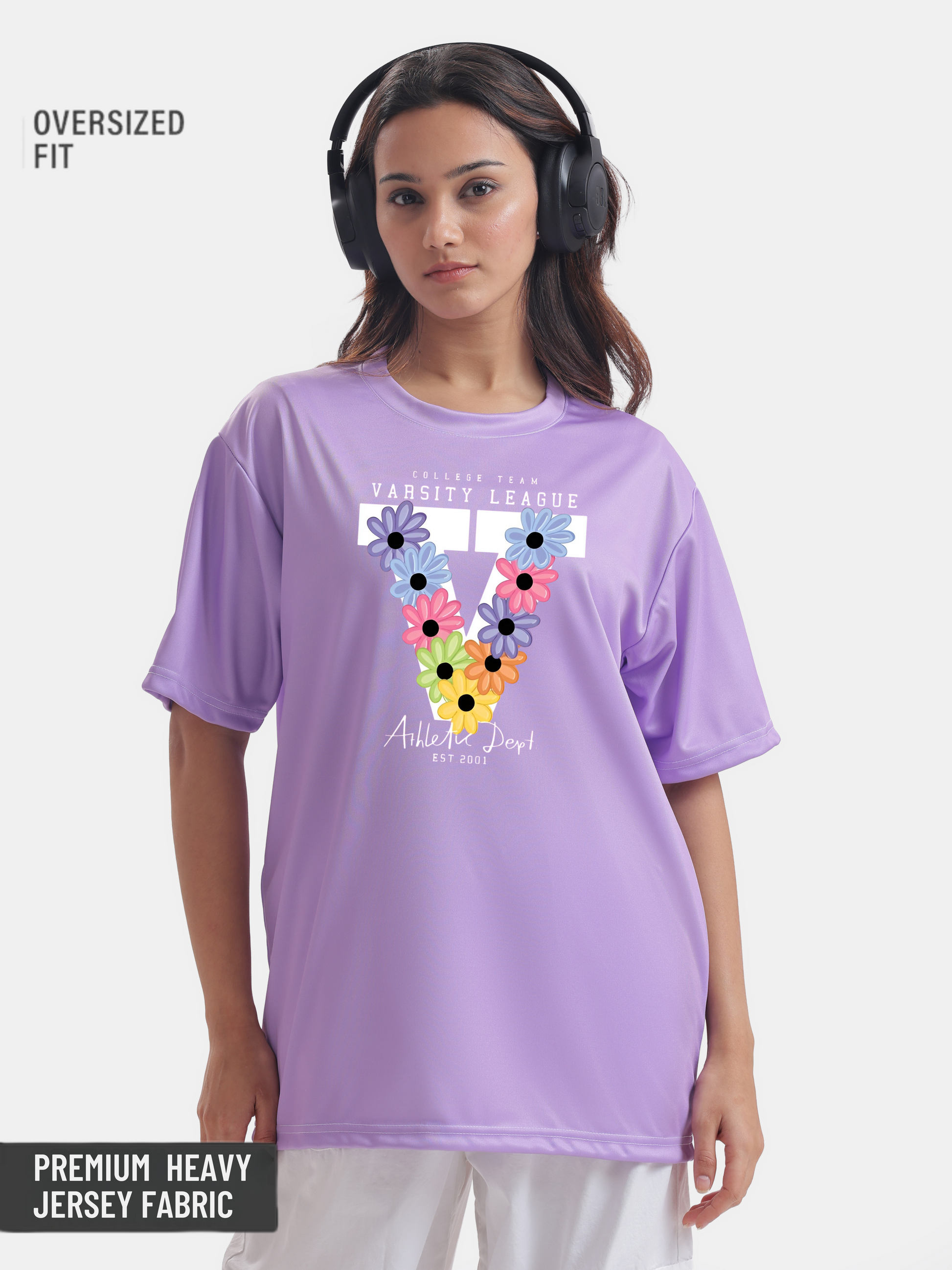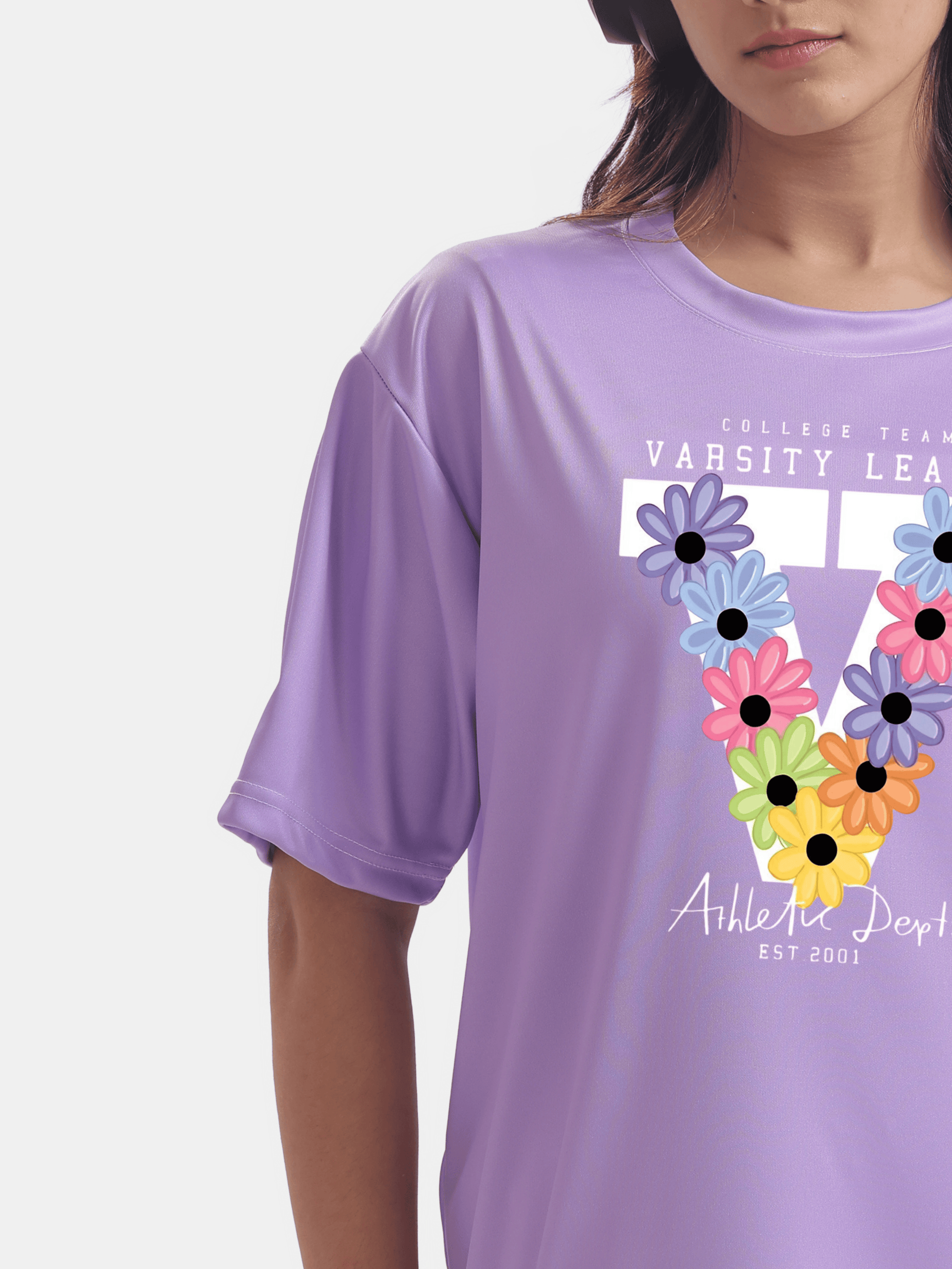 Embrace your casual style with this relaxed oversized grey lavender t-shirt, perfect for sports or gym workouts or laid-back outings with your bf (boyfriend) or friends and family, featuring a vibrant 'V' with multi-color flowers that represents the spirit of the college team varsity league Russian athletic department est. 2001 , allowing you to tell your own story while staying comfortable and chic.