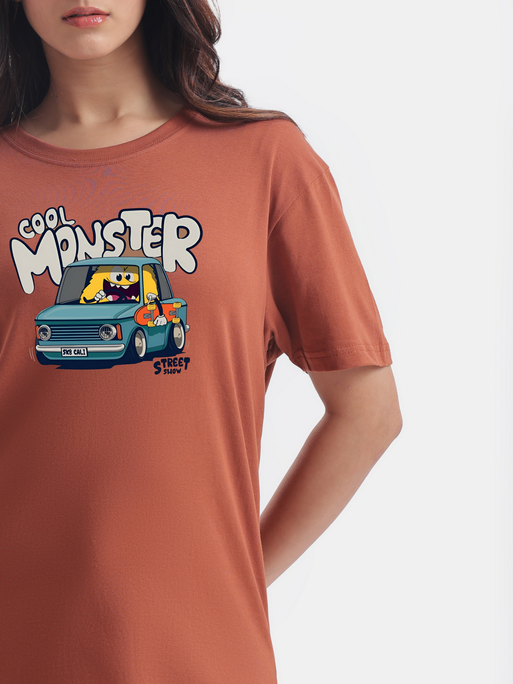 Get ready to embrace your fun side with this stylish casual copper t-shirt featuring an adorable, funny monster who’s all about living life in the fast lane, holding a skateboard in one hand and a steering wheel in the other as he zips around town in his cool car.