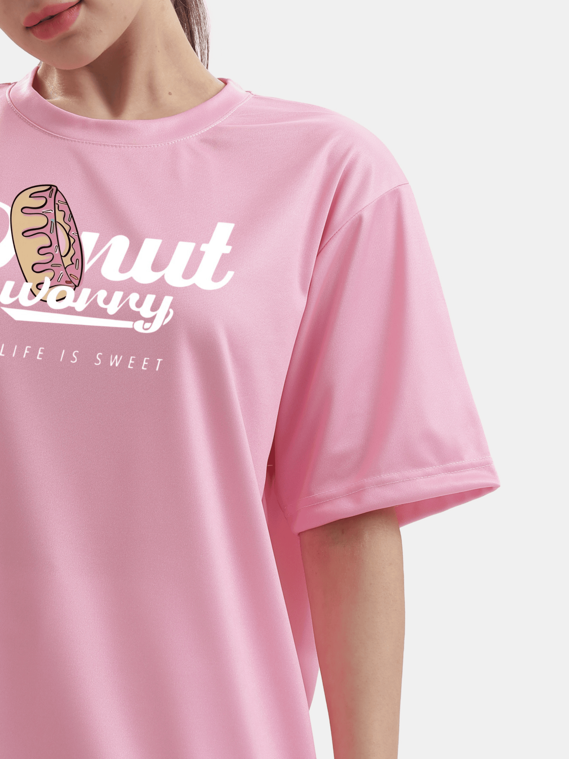 Embrace a carefree vibe with our relaxed oversized light crimson t-shirt, perfect for any casual outing with your bf (boyfriend) or friends and family or intense gym workout sessions, featuring a delicious donut with pink strawberry glaze and colorful fruity sprinkles toppings that embodies the spirit of "donut worry, life is sweet."