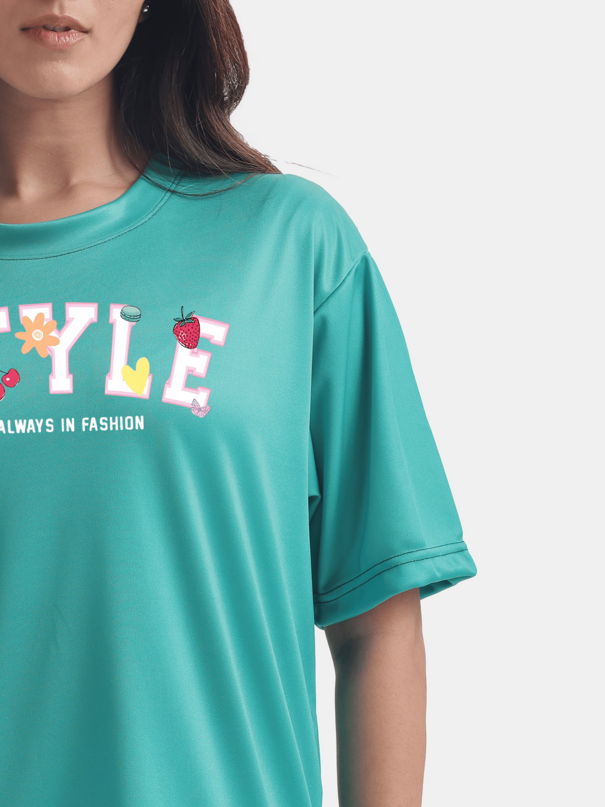 Embrace carefree style with our relaxed oversized turquoise t-shirt, crafted from performance fabric that effortlessly transitions from gym workouts to casual outings with your bf (boyfriend) or friends and family, featuring a trendy sporty English typography that sates style is always in fashion filled with vibrant fruits like cherry and strawberry, alongside playful flower, candy, butterfly, and love heart that tell your unique story.