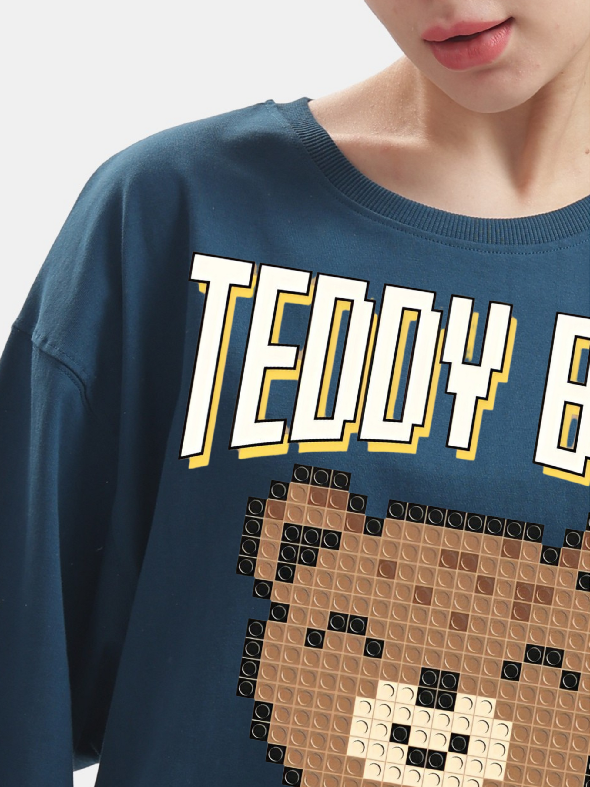 Experience effortless style with this relaxed oversized petrol blue t-shirt featuring a cheerful teddy bear crafted from building blocks, complete with a playful "teddy bear" inscription and a heartwarming smile quote, making it the perfect casual wear to pair with your favorite jeans or favourite shorts for a laid-back yet trendy look.