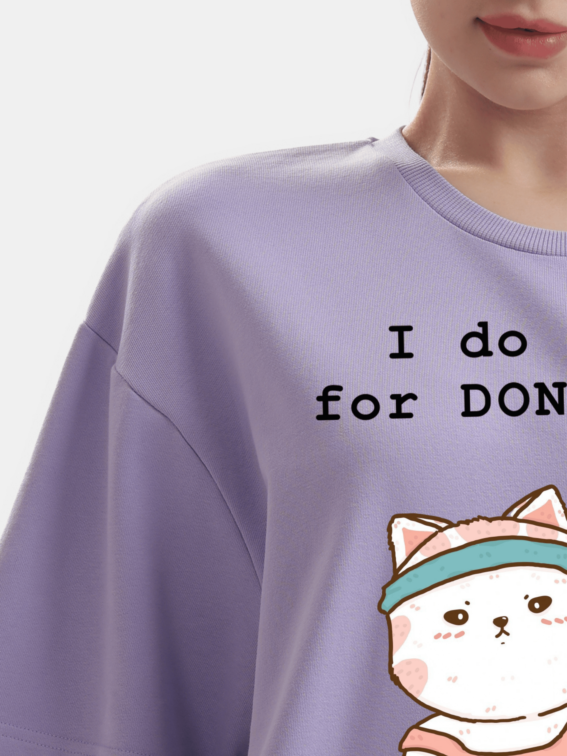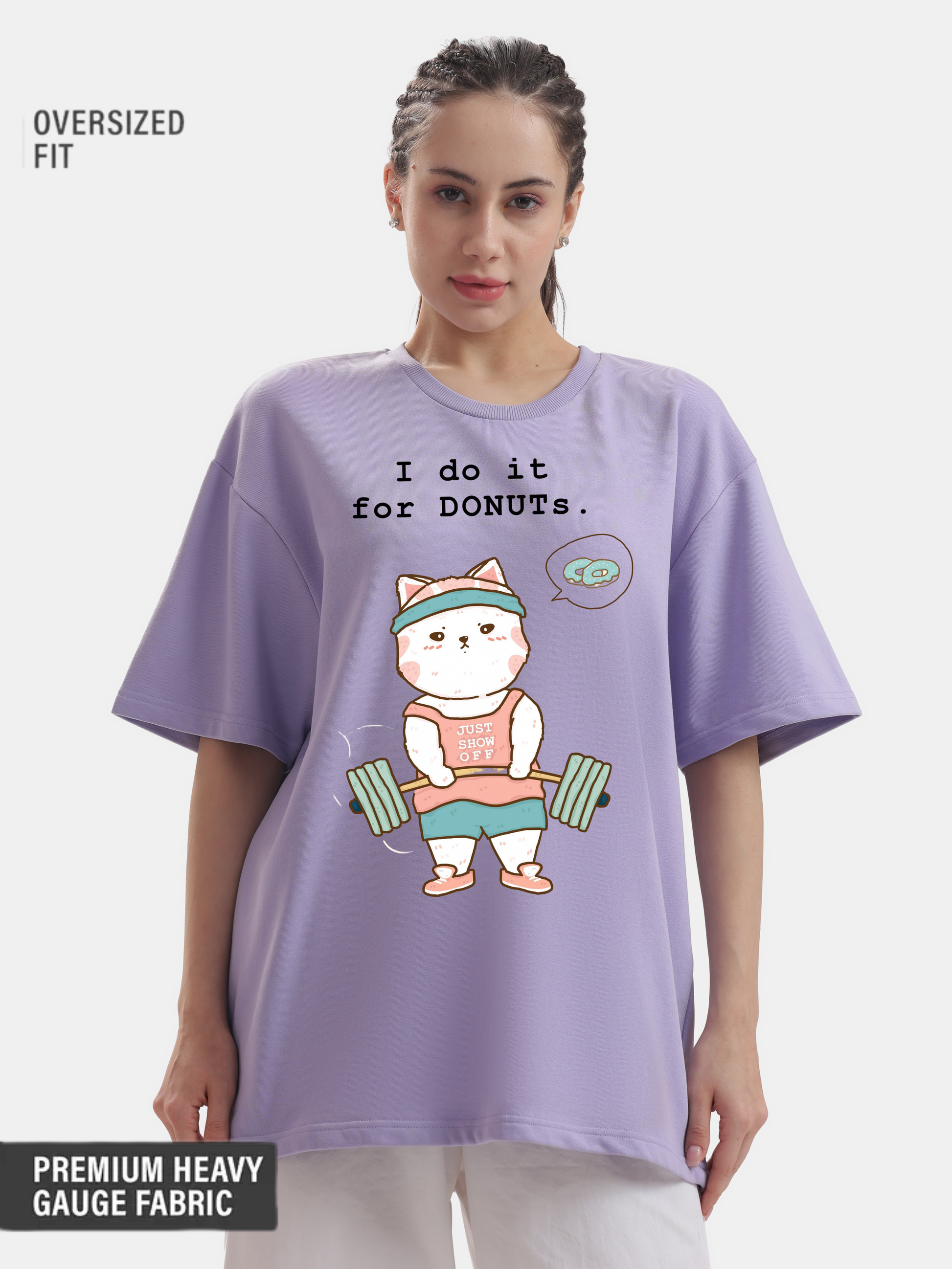 This relaxed oversized lavender t-shirt features a playful cat lifting weights, embodying a fun spirit that says, "I do it for donuts," making it the perfect casual wear for anyone looking to stay stylish while lounging in home with bf or casual outing with friends and family.