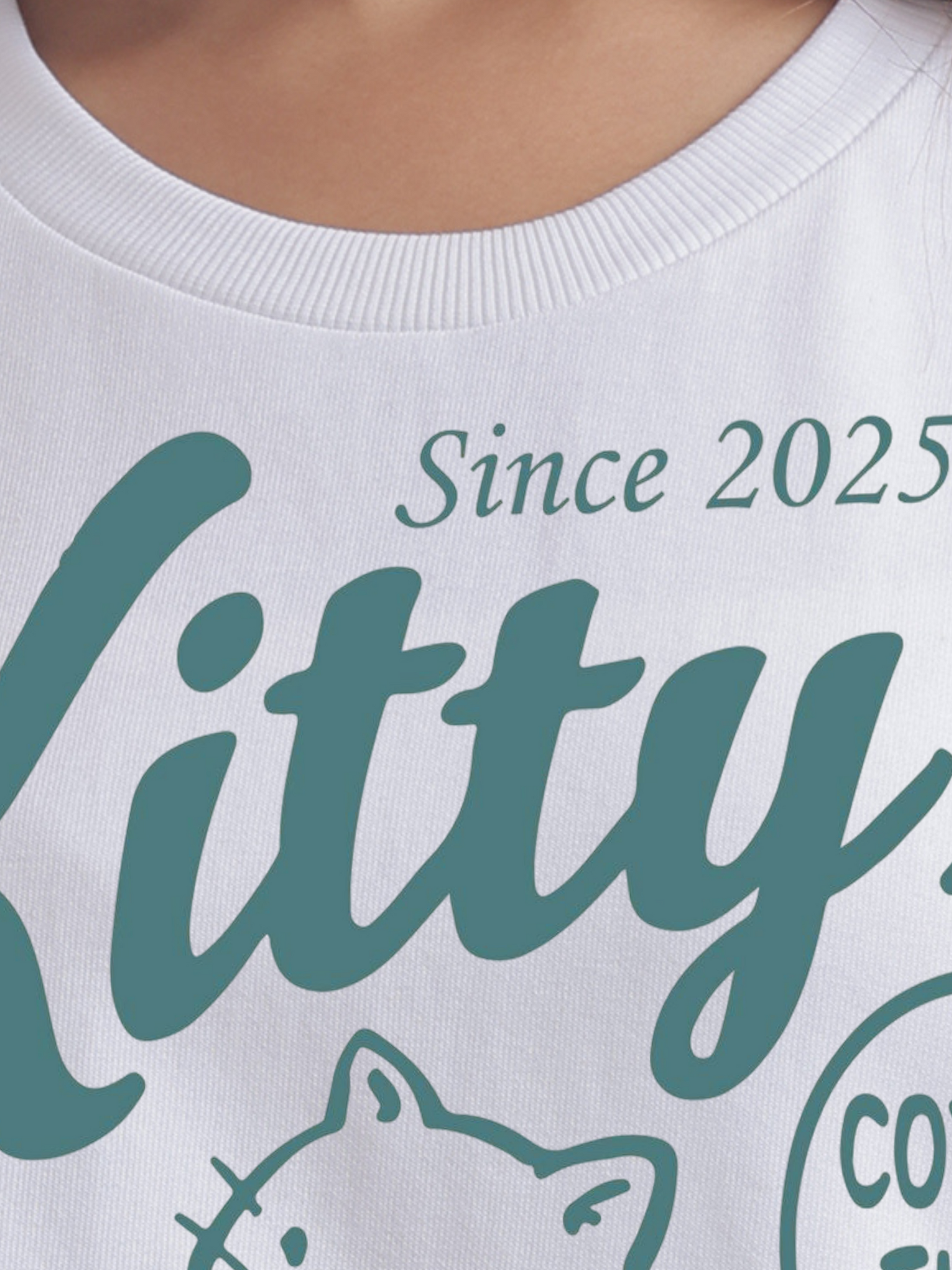This relaxed oversized white t-shirt features a playful kitty cat dashing with a coffee cup and saucer, evoking a charming scene that tells the story of the whimsical "Purr City Coffee" since 2025, making it a stylish choice that's perfect to pair with your favorite jeans or favourite shorts for a casual day out with your bf (boyfriend) or friends and family.