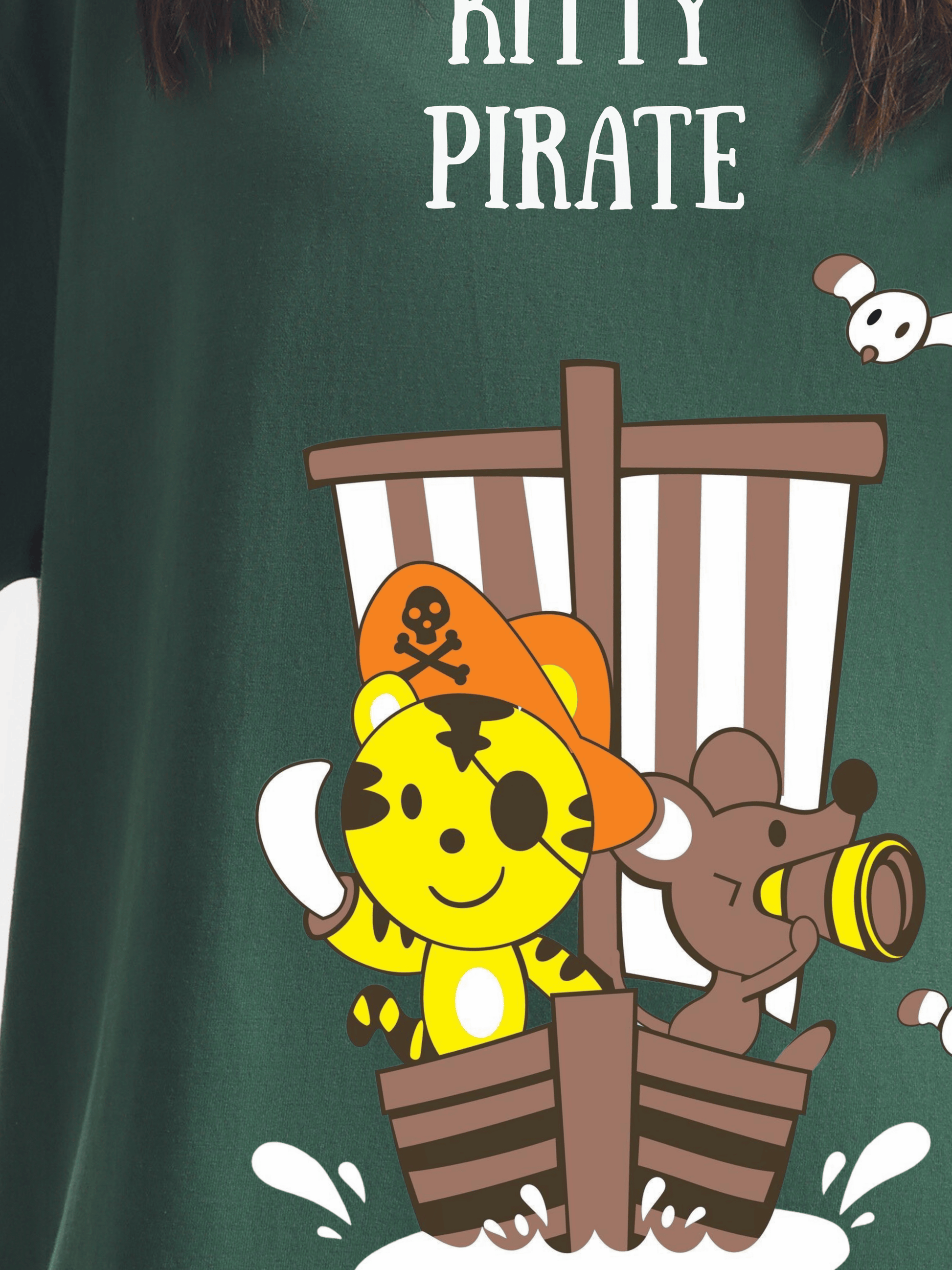 Set sail on a whimsical adventure with this relaxed bottle green t-shirt featuring a pirate kitty cat sporting an eye patch, wielding a knife in its paws, alongside a mouse peering through a telescope, all while waves crash around them and birds soar above, making it the perfect casual yet stylish piece to pair with your favorite jeans or favourite shorts for a laid-back day out with your bf (boyfriend) or friends and family.