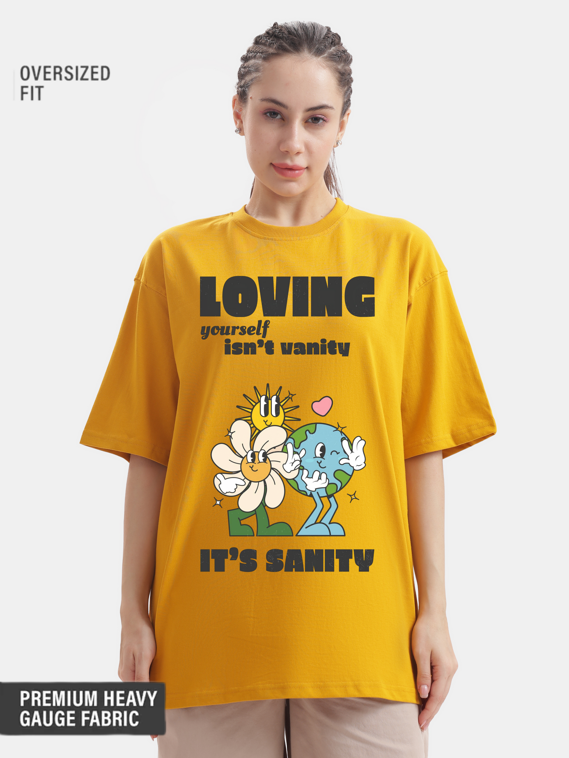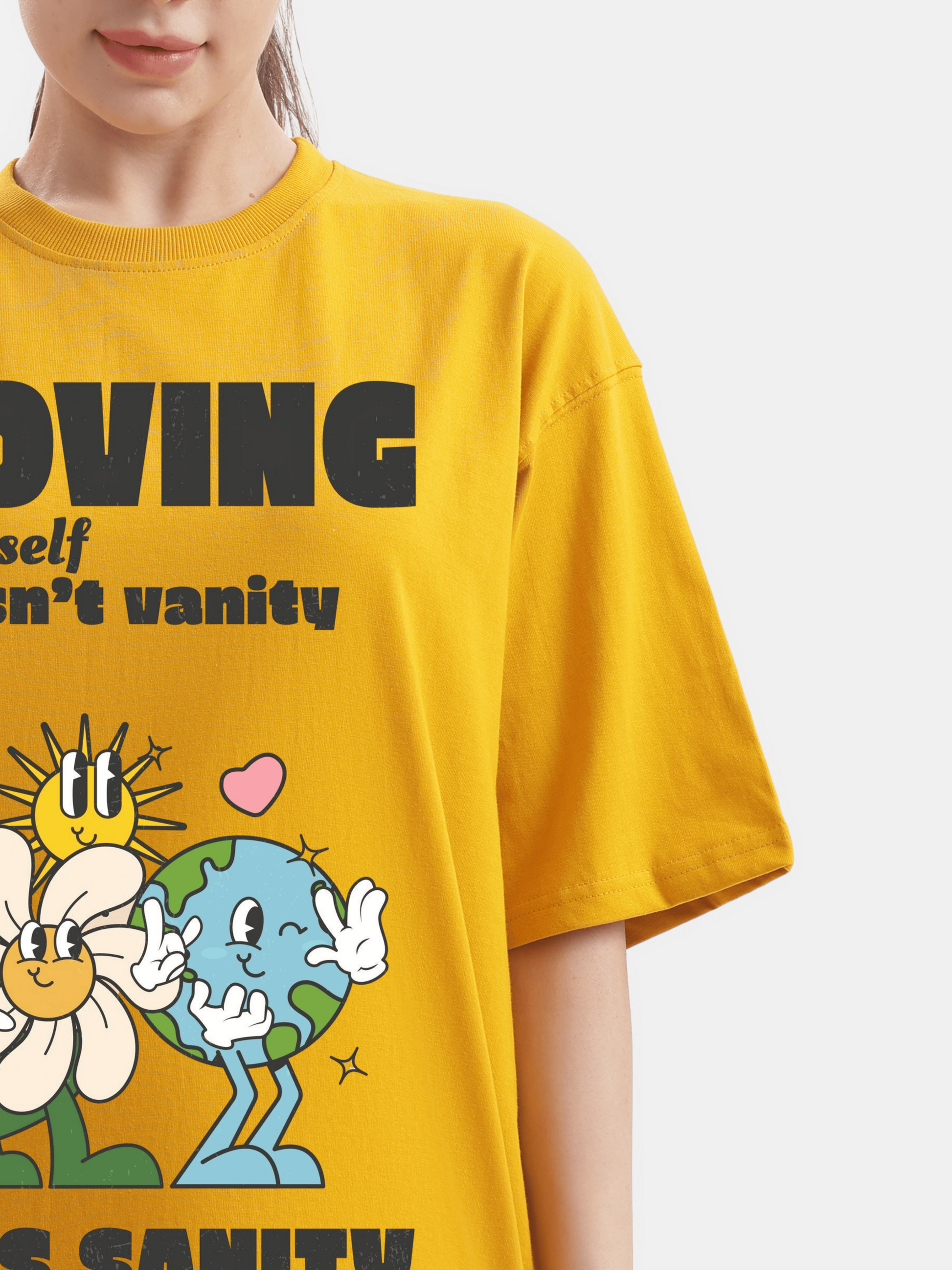 This relaxed oversized mustard yellow t-shirt features a playful animation of Earth and flowers dancing under a sunny sky, surrounded by hearts, all while conveying the uplifting message that "loving yourself isn't vanity it's sanity," making it the perfect casual yet stylish choice to pair with your favorite jeans or favourite shorts for a laid-back day out with your bf (boyfriend) or friends and family.