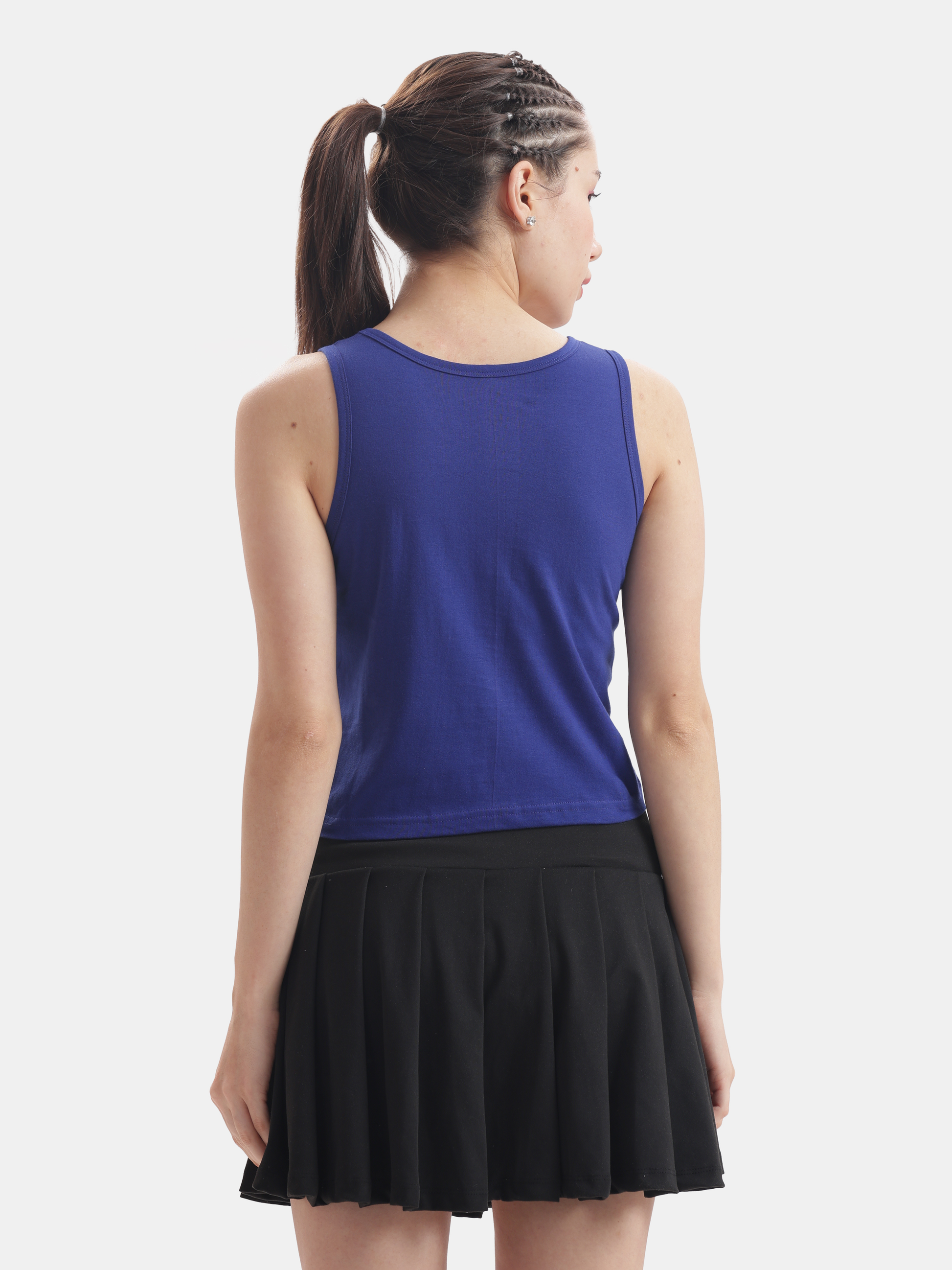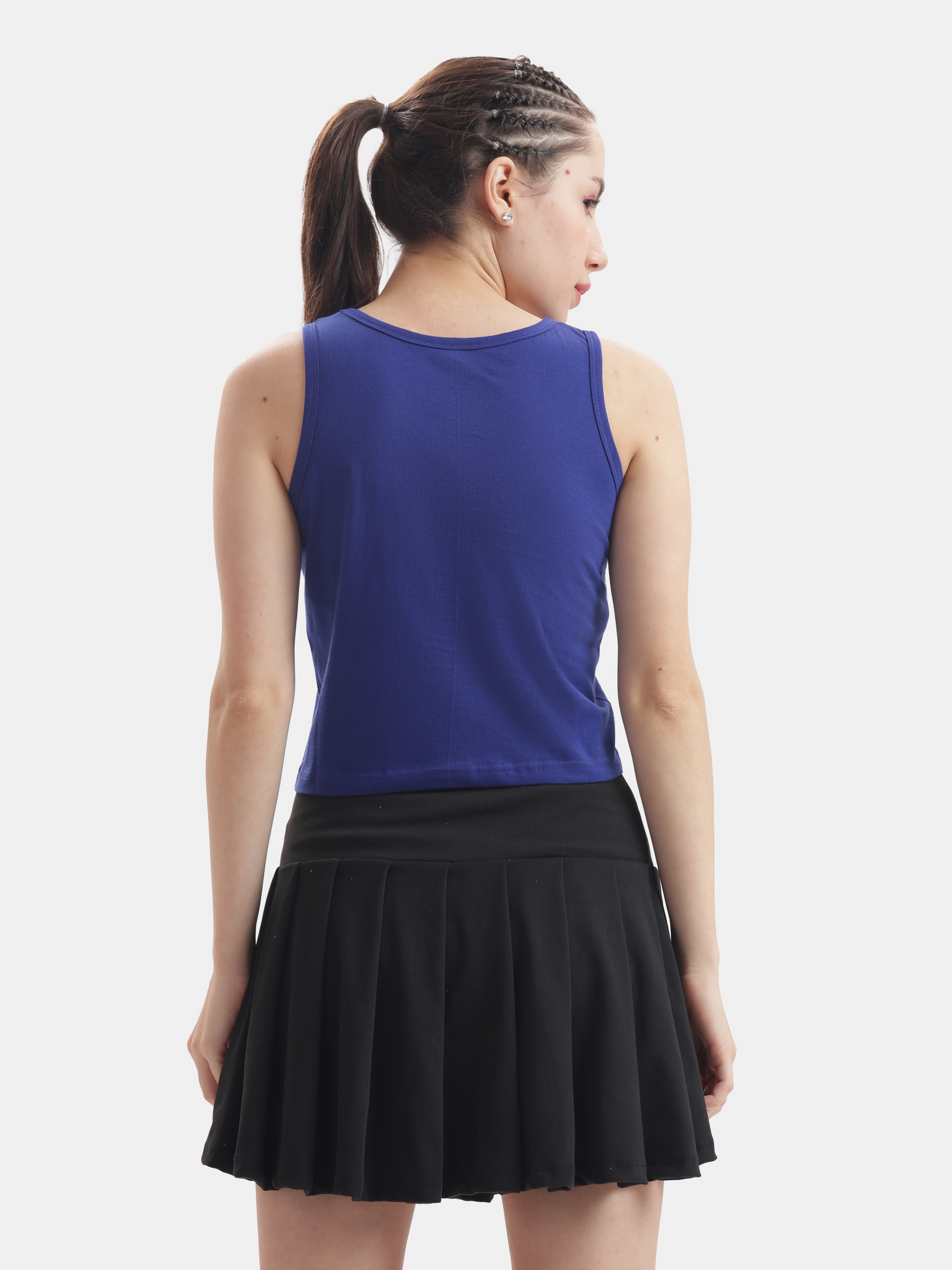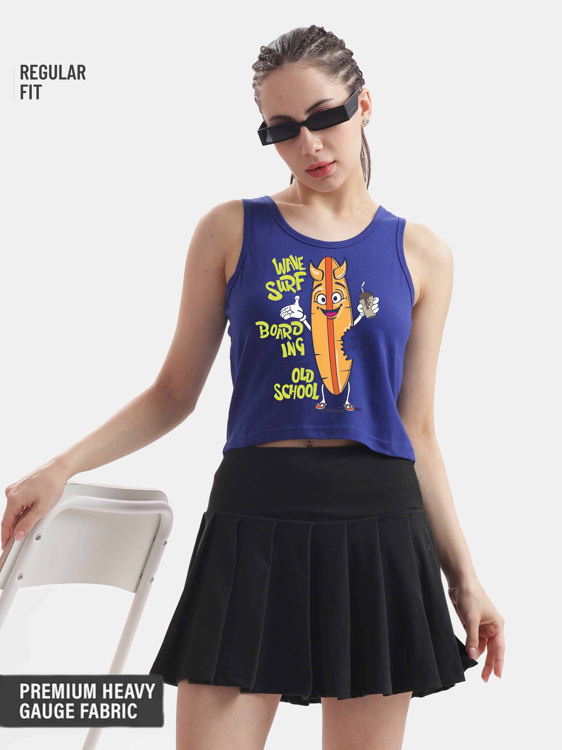 Ride the waves of nostalgia in this royal blue crop tank top featuring a hilarious cartoon character—a quirky broken skateboard with horns, a face, arms, and legs, rocking beach slippers while sipping a milkshake through a straw, making it the perfect casual and stylish piece to pair with your favorite denim or favourite shorts.