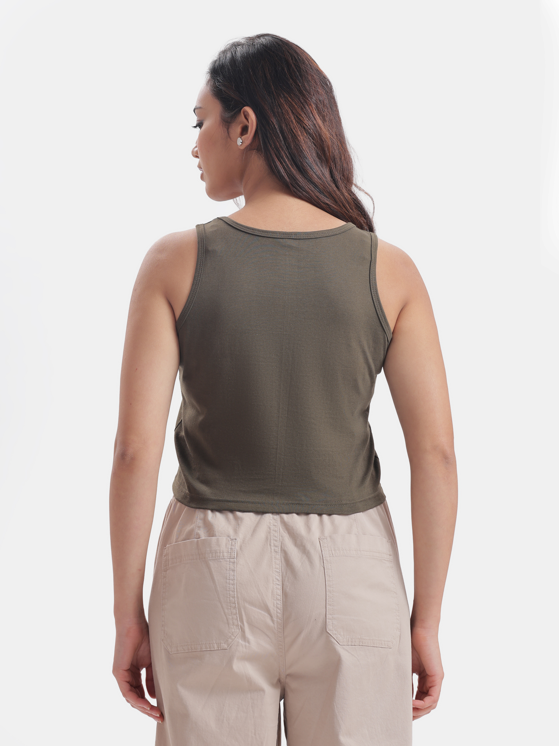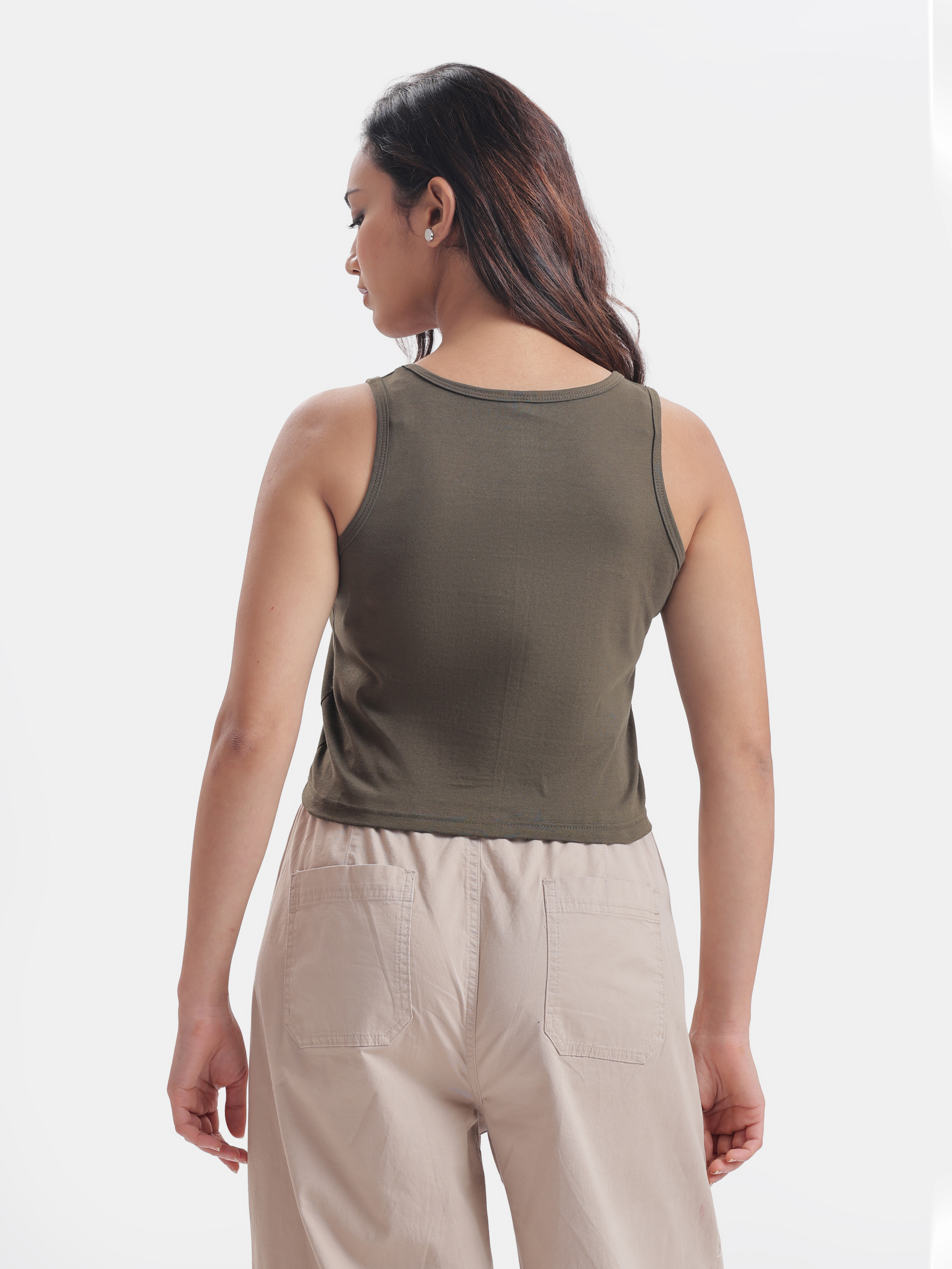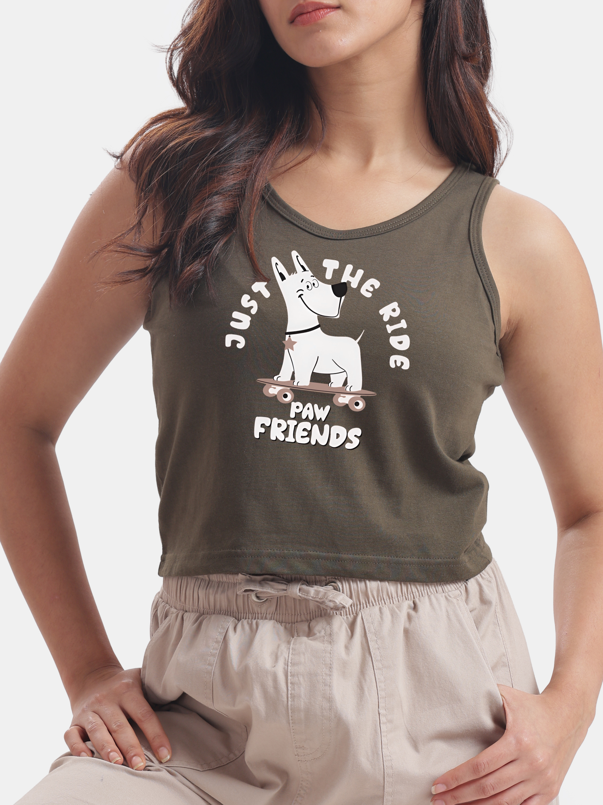 Picture a sunny afternoon where you and your furry friend are cruising down the street, your dog confidently riding a skateboard beside you, all while rocking a stylish olive green crop tank top that perfectly captures the spirit of adventure—it's the ideal casual outfit for a fun day out with your bf (boyfriend) or friends and family, easily paired with your favorite jeans or favourite shorts for a laid-back yet trendy look.