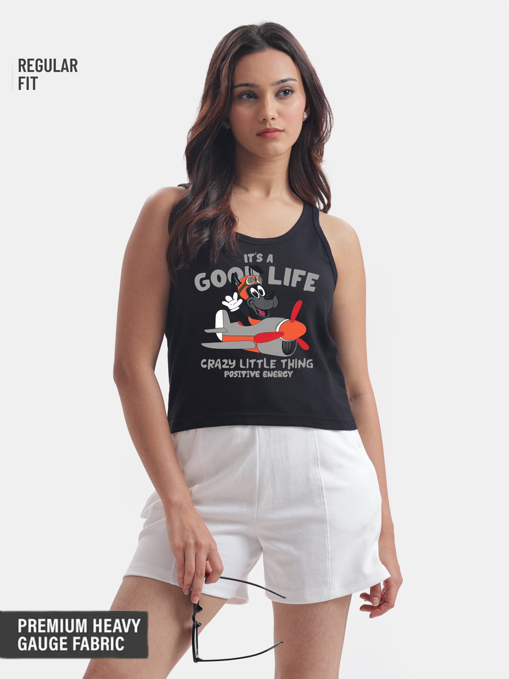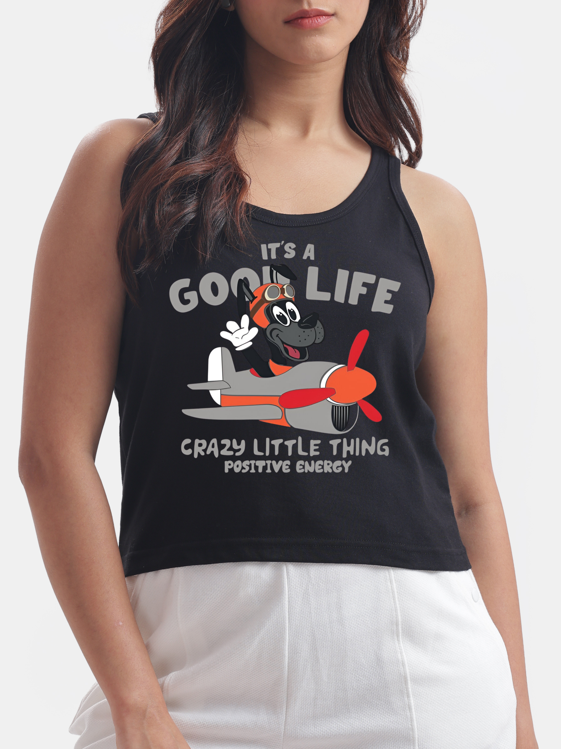 Embrace a carefree vibe with this stylish black crop tank featuring a whimsical cartoon dog with a funny ear joyfully riding an airplane, perfectly embodying the positive vibes and motto "it's a good life, crazy little thing," and making it a fun addition to your casual wardrobe that pairs effortlessly with your favorite jeans or favourite shorts.