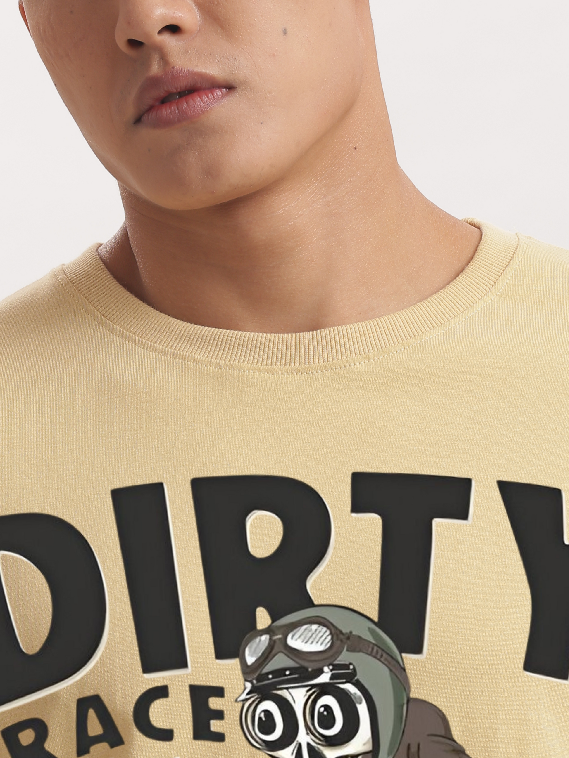 Embrace the thrill of the open road with this relaxed oversized beige t-shirt, featuring a rugged dangerous skeleton wearing a helmet and a crazy biker jacket, capturing the spirit of the Dirty bike Race, where daring riders battle it out in the heart of New York City USA, perfect to pair with your go to jeans or joggers