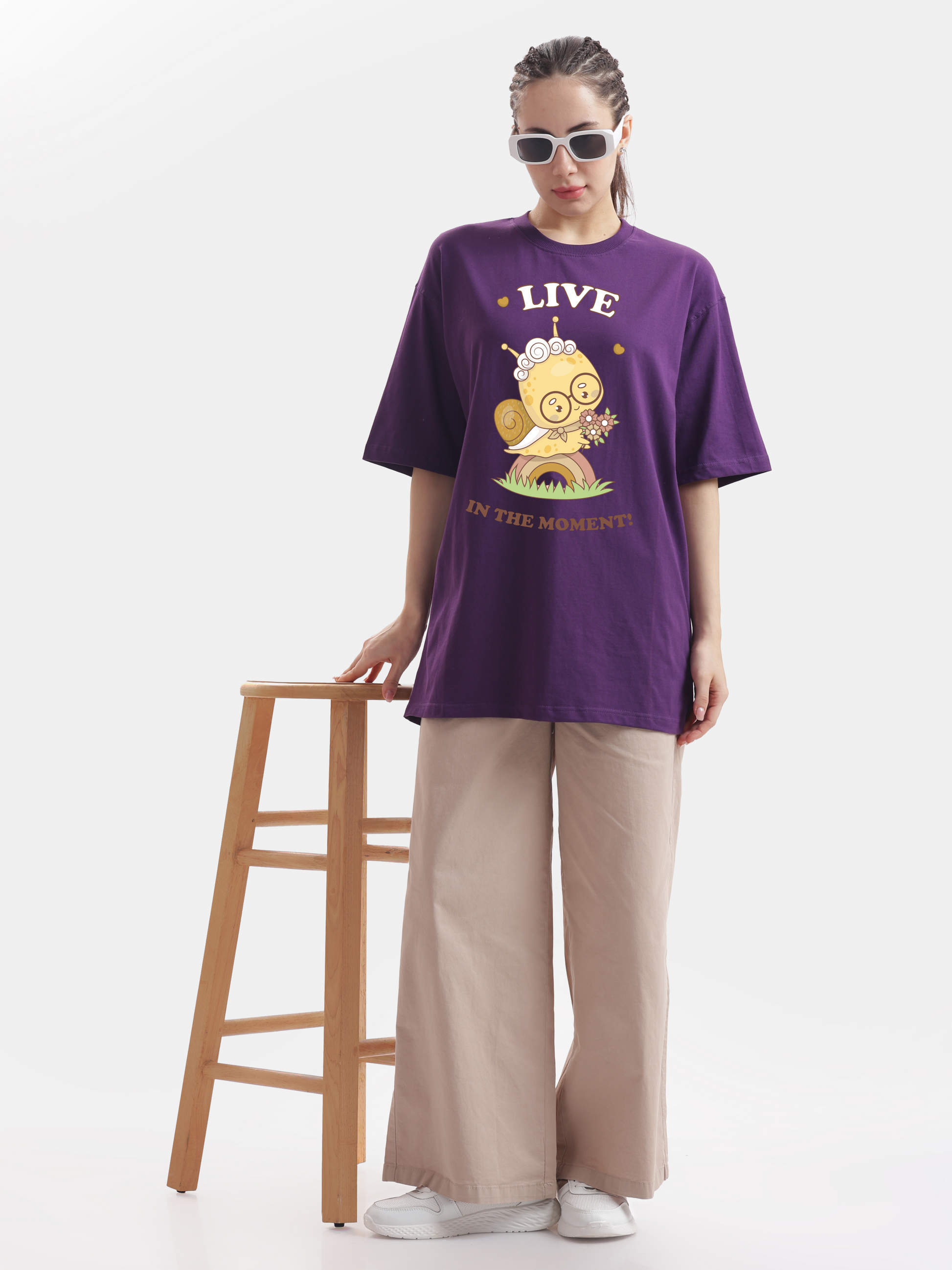Embrace a carefree vibe with this relaxed oversized purple t-shirt featuring a charming snail sitting on a rainbow, clutching a floral bouquet, complete with stylish glasses, all set against a grassy backdrop, reminding you to live in the moment.