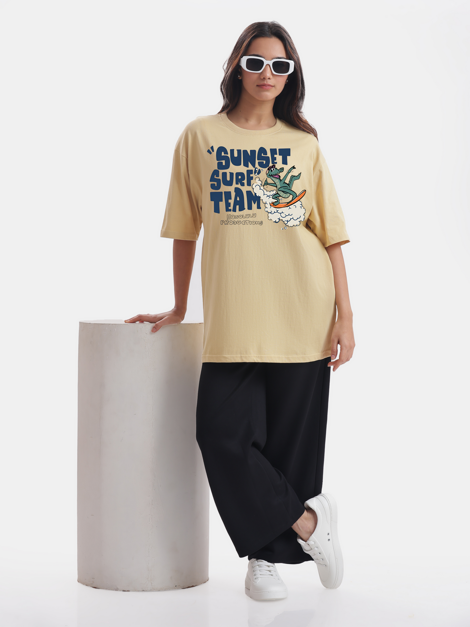 Cherish your laid-back style with this cozy beige t-shirt featuring a mischievous crocodile catching waves in sunglasses, perfect for a beach day with your bf (boyfriend) or a casual outing with friends and family, effortlessly pairs with your favorite denim shorts or comfy joggers.