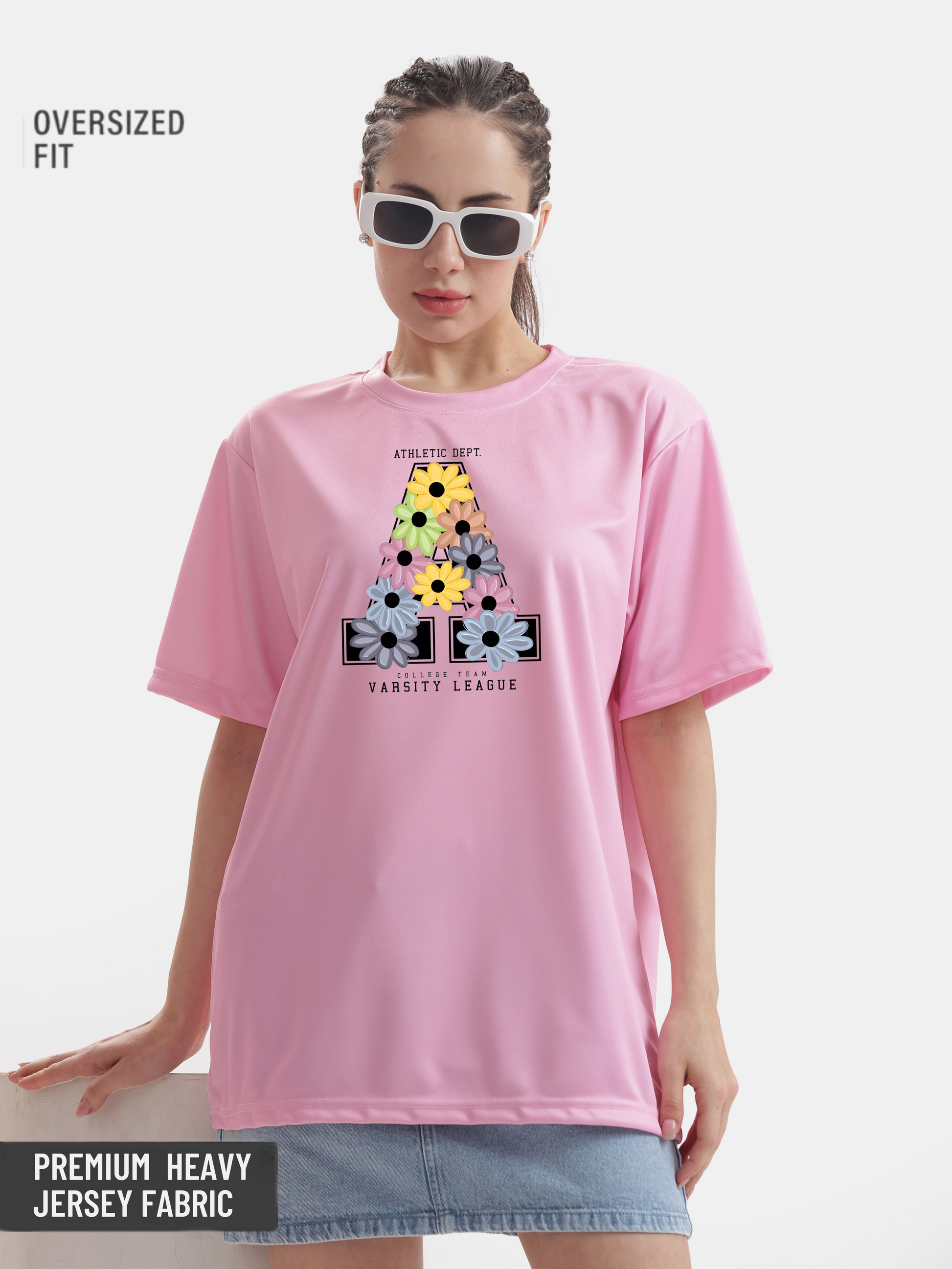 Embrace effortless style with this relaxed oversized light pink t-shirt, perfect for athletic activities(gym sessions, sports) or laid-back outings with your bf (boyfriend) or friends and family, featuring a vibrant "A" adorned with colorful flowers that tells unique story about a college team in Irish varsity league.