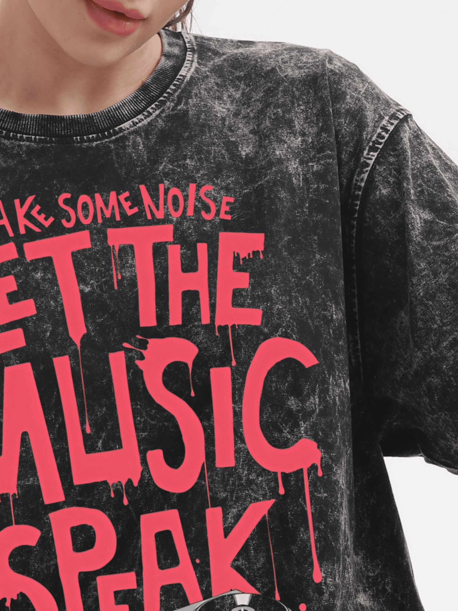 Elevate your casual style with this relaxed oversized vintage black acid wash t-shirt featuring vibrant red English typography that boldly proclaims "make some noise, let the music speak," making it the perfect piece for any party or laid-back gathering with friends and family, easily paired with your favorite jeans or favourite shorts for an effortlessly cool look.